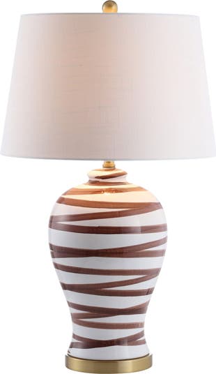 With artistic flair, the painterly glaze on this classic lamp silhouette brings one of this season's hottest trends to your home. Applied by hand, the brown linear brushstrokes create an abstract effect on the smooth, curved body while a crisp white drum shade completes the look. Finished on each end with a brass base and finial, it's a versatile style that will bring an understated note of artistic expression to any room.