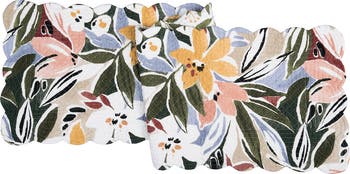 This 14" x 51" Joelle Floral Palm Leaf Table Runner is a beautiful addition to any dining area, featuring a colorful design with vibrant flowers and palm leaves. Perfect for spring and summer, it brings a refreshing and lively ambiance to your tabletop. Whether you're hosting a dinner party, enjoying a casual meal, or celebrating a special occasion, this runner complements a variety of table settings. Made from durable cotton fabric, it offers both resilience and softness, ensuring it stands up to everyday use while feeling gentle on your table. The machine-washable material ensures hassle-free maintenance, making it easy to keep your table runner looking fresh and vibrant throughout the seasons. Add this elegant runner to your kitchen, dining room, or even as a gift to someone special. The timeless design pairs seamlessly with other decorative elements, enhancing your space with a touch of nature-inspired charm that’s both practical and stylish.