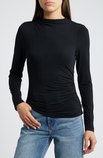 Gathered shoulders and ruched sides gently shape a stretchy jersey blouse topped with a drapey funnel neckline.