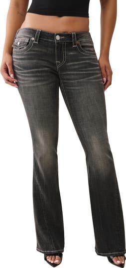 Horseshoe stitching at the flap pockets adds signature True Religion style to stretchy, weekend-ready flare jeans made with a superlow waist.