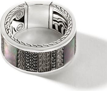 An eclectic mix of black mother-of-pearl inlays and pavé stones enriches this handcrafted sterling silver band marked with signature carvings.