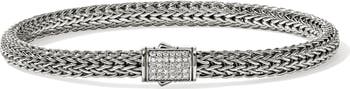 The art of Balinese chain weaving is masterfully displayed on this handcrafted chain bracelet secured with a push clasp illuminated with pavé diamonds.