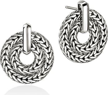 The label's signature flat-weave design shines in sterling silver on these artfully handcrafted frontal hoop earrings anchored with a knife-edge link.