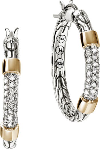These two-tone hoop earrings are artisan handcrafted with John Hardy's signature carved chain motif and a finely set pavé diamonds.