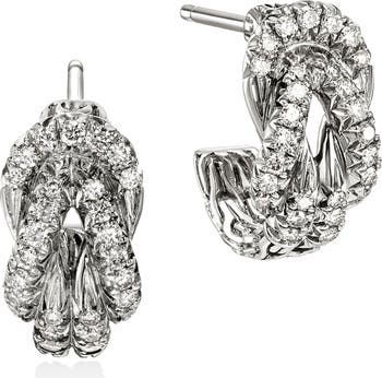 The bonds of love manifest in sculptural, diamond-covered knots at the center of these handcrafted hoop earrings.