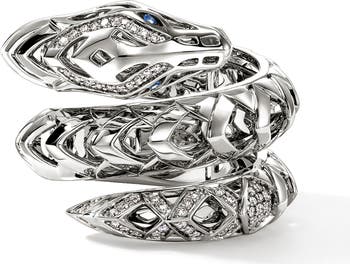 Balinese for “dragon,” naga is a legendary symbol of love, protection and prosperity in this hand-carved ring that coils around your finger and sparkles with icy diamonds and blue sapphire eyes.