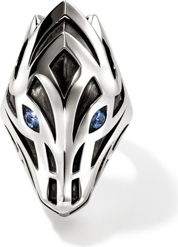 Inspired by a mythical talisman, this handcrafted sterling silver ring is intricately carved and studded with scintillating sapphires.