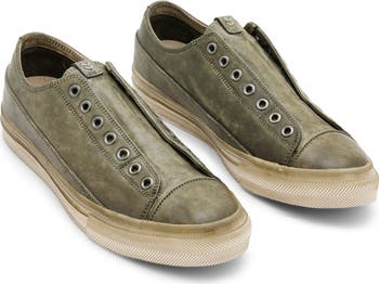 Distressed leather and glinting hardware lend rustic style to a laceless sneaker that's ready to explore.
