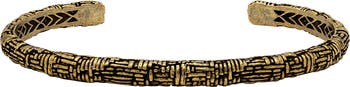 This golden cuff bracelet features an intricate texture emphasized by an aged finish.