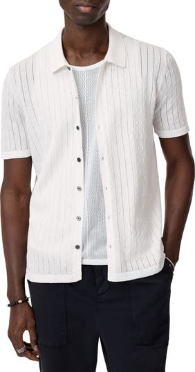 Knit from lightweight organic cotton, this polo-inspired sweater has short sleeves, a full button placket and a mix of stripes to create a modern cable texture.
