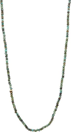A single brass skull lurks among the 239 turquoise rondelles of this elegantly earthy long necklace.