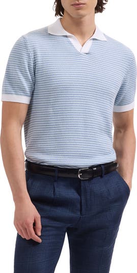 Made from a soft cotton blend, this vintage-inspired short-sleeve sweater is finished with textural stripes and a casual, open collar.