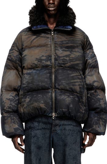 This puffer jacket is rendered in the brand's signature destroyed denim that's laser treated and washed to create a dirt-effect camoflauge pattern. A high collar with a plush faux-shearling interior, along with adjustable drawstrings at the cuffs and hem, make sure you keep warm this winter season.
