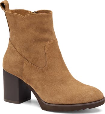 A subtle platform and chunky block heel add walkable height to a waterproof suede bootie featuring TRUFOAM® cushioning and a rubber sawtooth sole.