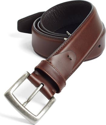 Waxed calfskin leather forms a handsome belt fitted with antiqued nickel hardware.