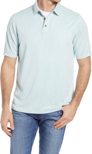 A minty hue freshens this soft, slub knit polo knit with an easy-fitting drape.