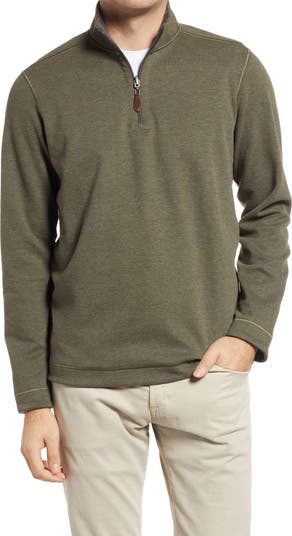 Two heathered colors double the wearing options of a reversible pullover made with soft cotton in a fit that layers easily into any cold-weather wardrobe.