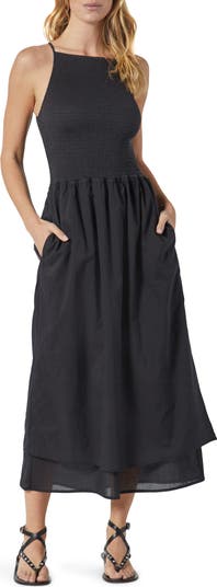A smocked bodice shapes this breezy linen-blend maxi designed with cutaway shoulders and handy pockets.
