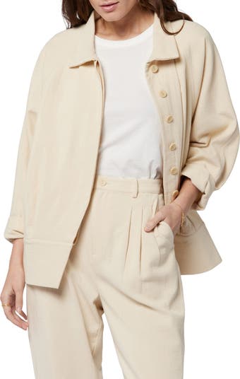 A lightweight jacket is cut from lightly textured cotton and rendered in a matches-anything hue.