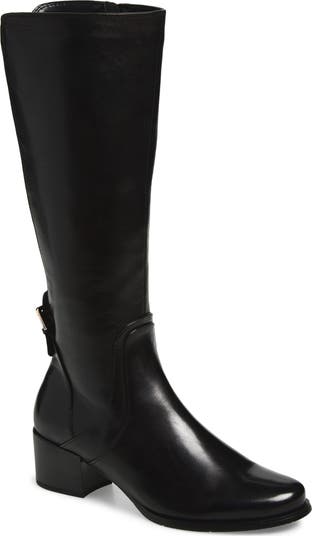 A back buckle strap adds just the right touch of moto edge to a polished leather boot set on a just-right block heel.