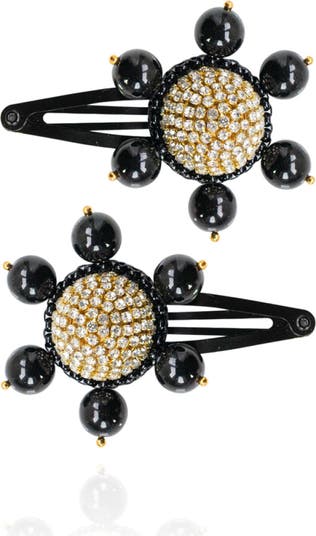 Go for classic glam with the Jolie Barrettes, a pair of shining hair clips with a starburst statement. | An extravagant rhinestone center punctuated by beaded rays makes the Jolie Barrettes the loud, lavish accessory you need to boost a fresh blowout or help slick back day-three strands. | Materials: Gold Plated Stainless Steel Beads, Crystal Rhinestones, FSC Wood Base, Upcycled Vegan Leather Backing, Golden Stainless Steel Barrette | Size: H: 2.5” | W: 1.75” Weight: 0.4 oz |