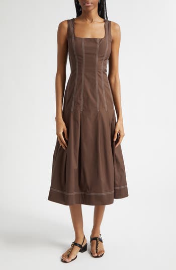 Contrast stitching gives corset-inspired shape to this crisp cotton dress eased with a bit of stretch.