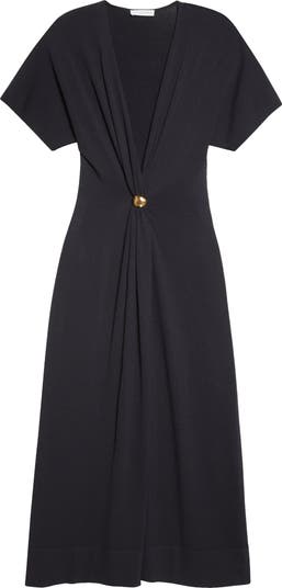 Goldtone hardware cinches the waist of this stretch-cotton dress topped with a plunging neckline that brings sultry edge to the A-line silhouette.