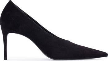 Pointy toe classic pump, set on a high pin heel. Made with brushed kid suede.