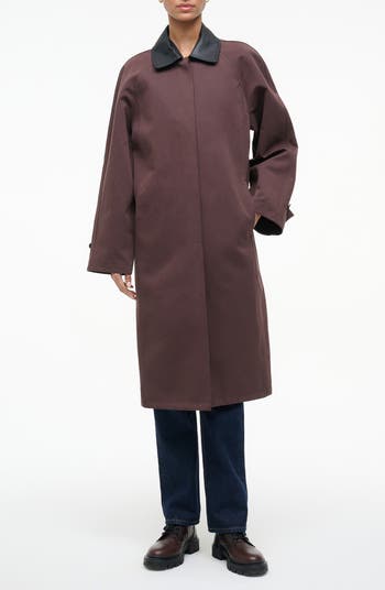 Look sharp on your mild-weather commute in this lightweight and cleanly designed coat framed by wide raglan sleeves and topped with a leather collar.