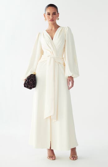 The Jonah Midi Dress by SAVEL is an elegant wrap-style dress designed with sophisticated drama. Its flowing profile features dramatic balloon sleeves and a graceful midi length that creates a refined, contemporary statement. The soft white hue ensures versatile styling for elevated occasions.