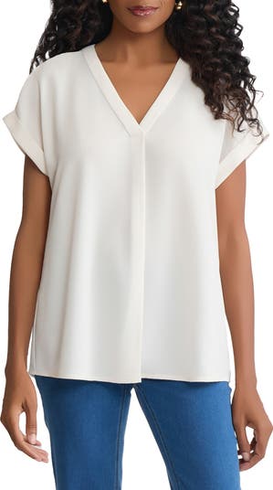 Cuffed dolman sleeves and a subtle front pleat enhance the flowy, relaxed fit of this popover top that transitions from the workday to weekend with ease.
