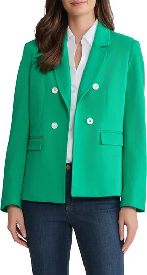 Contrast buttons define he double-breasted style of this sharp blazer complete with a back belt.