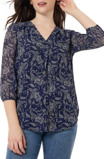Move stylishly from desk to dinner in this front-pleat chiffon top covered in a swirling paisley print.