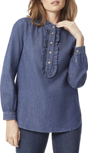 A ruffled placket lends country charm to a relaxed denim tunic top finished with shiny silvertone buttons.