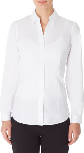 This classic button-up shirt with figure-defining darts is cut from cotton for comfort.