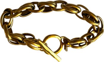 A simple yet unique bracelet! 7.5" of 12k antiqued gold plated stainless steel multi-ring chain tied together with a sweet little 12k antiqued gold plated pewter toggle clasp. It's the perfect layering piece with other jewels or can stun on its own!