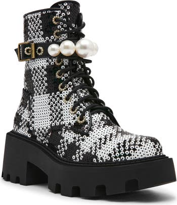 A buckle strap embellished with pearly beads adds an extra touch of whimsy to this outfit-making lug-sole boot.