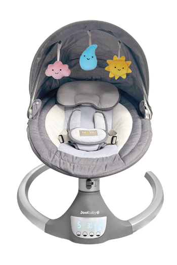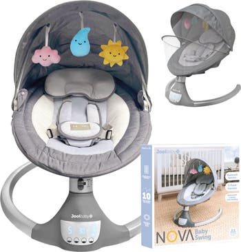 The Nova Baby Swing features 5 levels of side-to-side swaying motion and a built-in Bluetooth speaker for streaming music.
