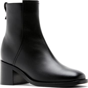 An uneven topline and smooth leather enhance the sleek, contemporary look of these block heel boots set atop cushioned support.