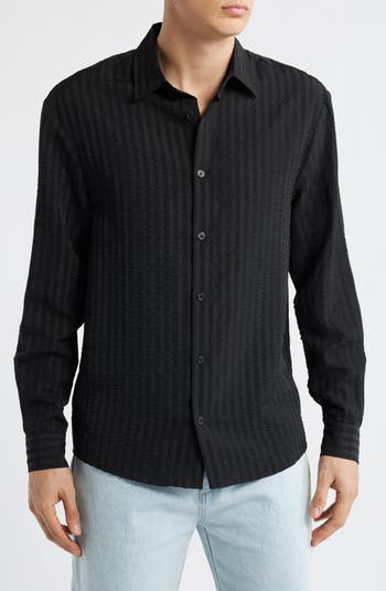 Stripes of perfectly rumpled seersucker made in part with silky lyocell bring sunny-day comfort to a lightweight shirt topped with a smartly pointed collar. Wear it layered, open, tucked or untucked to change up your look without losing your elevated style.