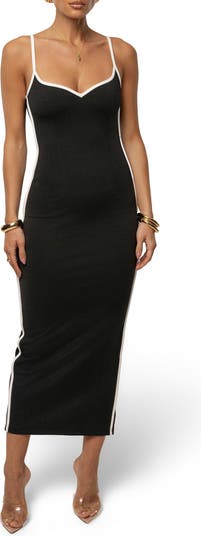 Build out your black-and-white collection with a slinky knit dress traced in a contrast outline.