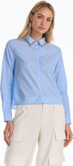 Where timeless meets statement—introducing the Josefina Crystal Button Up. This breezy blue-and-white striped shirt is anything but basic, thanks to its crystal-encrusted collar that adds a dose of sparkle to every look. Lightweight and versatile, it’s the perfect throw-on-and-go piece for summer days, whether you're dressing it up with tailored shorts or keeping it cool with relaxed denim. Effortless, elevated, and made to shine.
