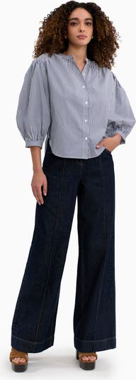 A fresh take on a timeless silhouette, this button-up blouse features subtle front gathering for soft shape and dimension. Voluminous lantern 3/4 sleeves taper at the cuff to create a feminine, balanced profile with a hint of drama. Created with an allover stripe pattern and an easy, relaxed fit, it's a versatile staple that pairs well with all your favorite bottoms.