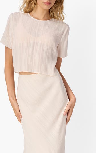 Tonal jacquard stripes bring textural allure to this cropped boxy top made semisheer for a light, summery vibe.