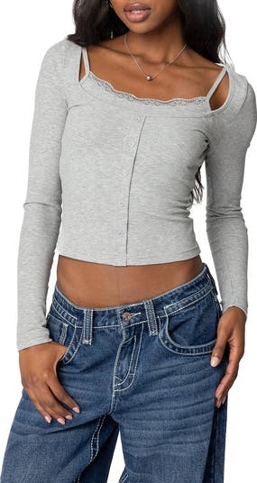 Complete your casual weekend look with the effortless style of this layered-look top detailed with a sweet lace trim at the neckline.