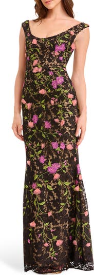 Floral appliqués and a lacy overlay amplify the modern romance of this stunning sleeveless dress in a mermaid silhouette.