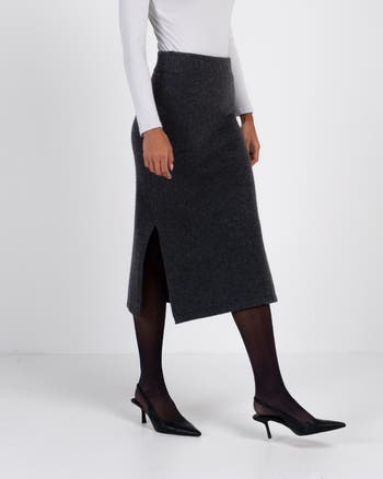 This knitted midi skirt is designed to move effortlessly between work, weekends and even partywear. Made from soft merino wool, it is breathable and soft while its natural stretch ensures a flattering fit that’s comfortable, too. The straight cut is fitted at the waist with a thick elasticated waistband, giving a smooth fit that feels secure yet easy to wear. Side slits add just the right touch of detail, making it a piece that’s both dressy and comfy.