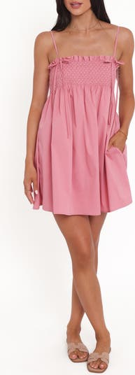 Ruffle trim at the neckline sweetens the style of this woven minidress complete with a smocked bodice.