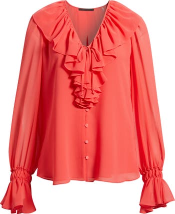 Floaty ruffles enhance the fluttering movement of this light and blousy front-button top.