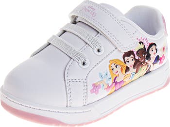 A hook-and-loop strap adjusts to their perfect fit in this durable sneaker featuring two rows of princesses to bring the magic of Disney to their everyday look.